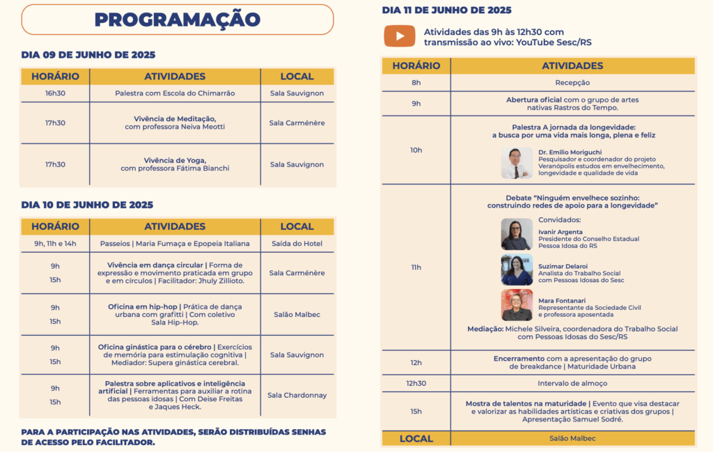 Após a palestra, haverá ainda a transmissão do debate “Ninguém Envelhece Sozinho”, com Ivanir Argenta, presidente do Conselho Estadual da Pessoa Idosa do RS, Suzimar Delaroli, analista do Trabalho Social com Pessoas Idosas no Departamento Nacional do Sesc e Mara Fontanari, representante da sociedade civil e professora aposentada. A programação, para quem participará presencialmente do evento, incluirá ainda atividades culturais e integrativas, com dança circular, ginástica cerebral, oficinas de tecnologia e orientações sobre saúde e segurança, além de passeios turísticos como à Maria Fumaça e à Epopeia Italiana, entre outras ações cuja programação pode ser conferida a seguir.