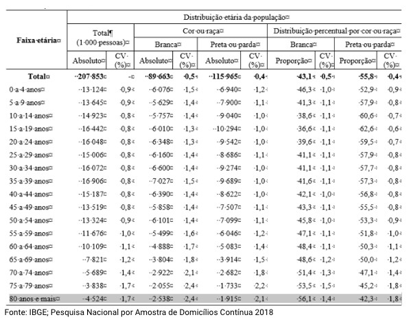 Distribuição etária por raça/cor em 2018