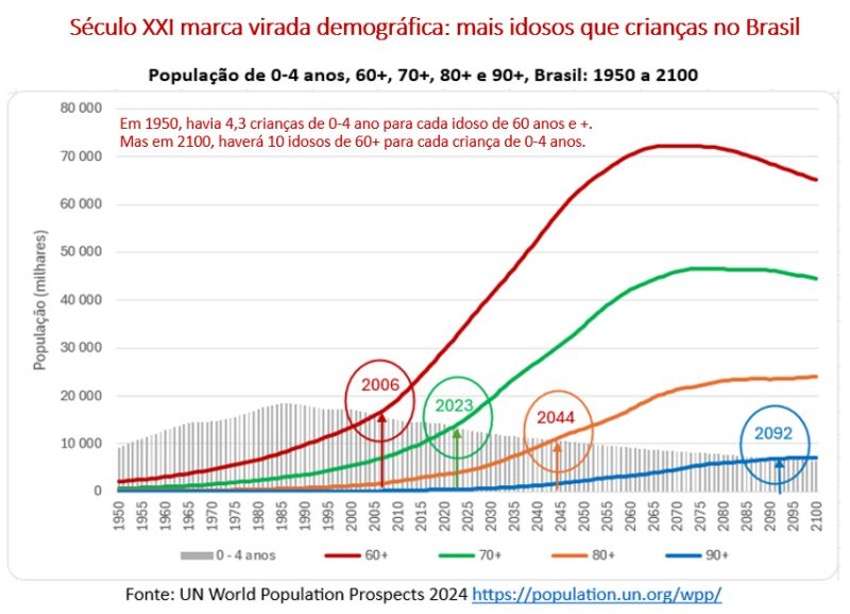 O envelhecimento em números foi destaque comum em todas as manchetes dos grandes jornais do país. Ou seja, não dá mais para não olhar para esse grande fenômeno chamado envelhecimento. Nosso colaborador, o demógrafo José Eustáquio Diniz Alves vem apontando isso nestes últimos anos aqui no Portal do Envelhecimento. Inclusive, no II Congresso Internacional Envelhecer com Futuro, realizado no final de outubro dentro do Fórum São Paulo da Longevidade, ele palestrou a respeito. Segundo ele, sem dúvida essa é a maior mudança da dinâmica demográfica brasileira no século XXI e pode ser analisada de inúmeras maneiras. Ele, inclusive, postou na sua rede do Linkedin alguns de seus artigos publicados no Portal sobre o tema e um gráfico(que reproduzimos abaixo) mostrando a virada demográfica. Esse gráfico, por si só, é um alerta que exige a atenção de todos os setores da sociedade.