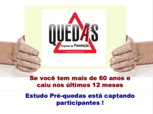 A pesquisa precisa de pessoas com 60 anos ou mais que tenham caído ao menos 1x nos últimos 12 meses para participar deste estudo. Interessados(as) enviar nome e telefone para: centralprevquedas@gmail.com. O estudo investiga se um Programa de Prevenção de Quedas de 12 encontros 1 x por semana de exercícios físicos + grupo de discussão + monitoramento médico reduz o risco de cair. Será feita uma avaliação prévia para identificar risco de cair.