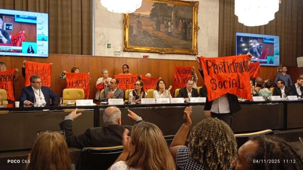 O Grito dos Excluídos e o Coletivo Envelhecer realizaram uma performance/protesto durante audiência realizada no dia 4 de novembro na Comissão de Finanças e Orçamento.